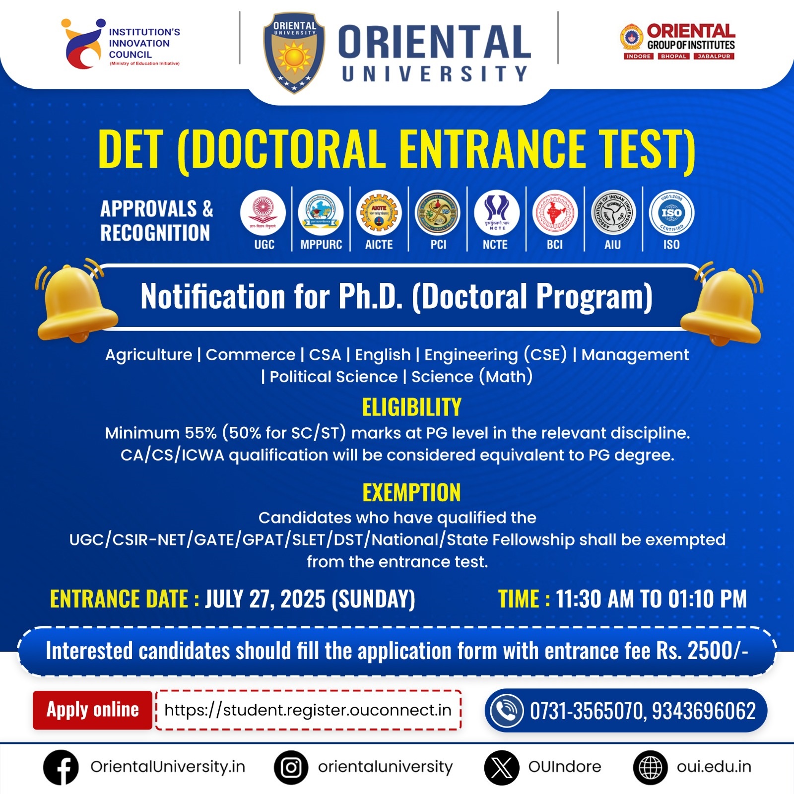 Ph.D courses | Oriental University, Indore exclusively established Research Cell for upliftment of research and started Doctoral Programs (Ph.D.) in the year 2015. Doctoral Program (Ph.D.) is governed by Ordinance 10 of the University. Ph.D Courses | Oriental University, Indore are offered by the faculty of Engineering & Technology, Faculty of Business Management, Faculty of Pharmacy, Faculty of Commerce, Faculty of Education, Faculty of Law and Faculty of Science. The Dean Research Studies is mentoring Doctoral Studies and Research activities for various Ph.D. program run by the constituent Institutes by the University.
