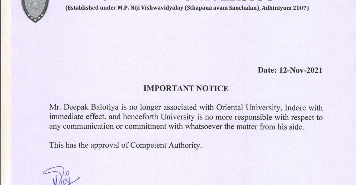 Mr. Deepak Balotiya is no longer associated with Oriental University