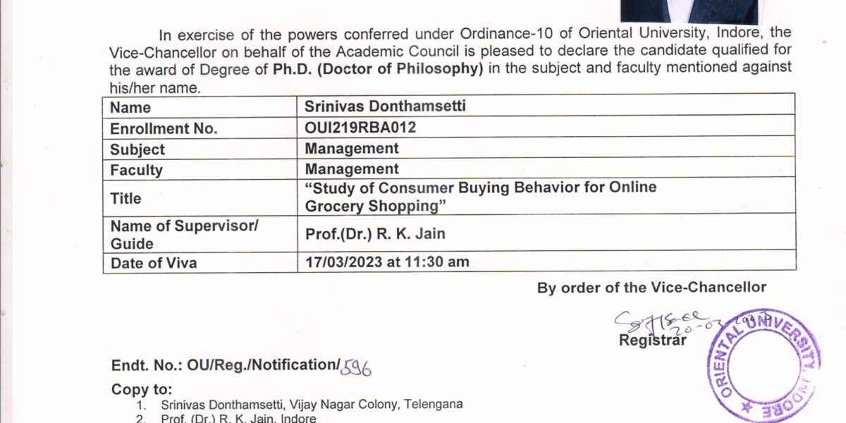 Ph.D. Doctoral Degree awarded to Mr. Srinivas Donthamsetti