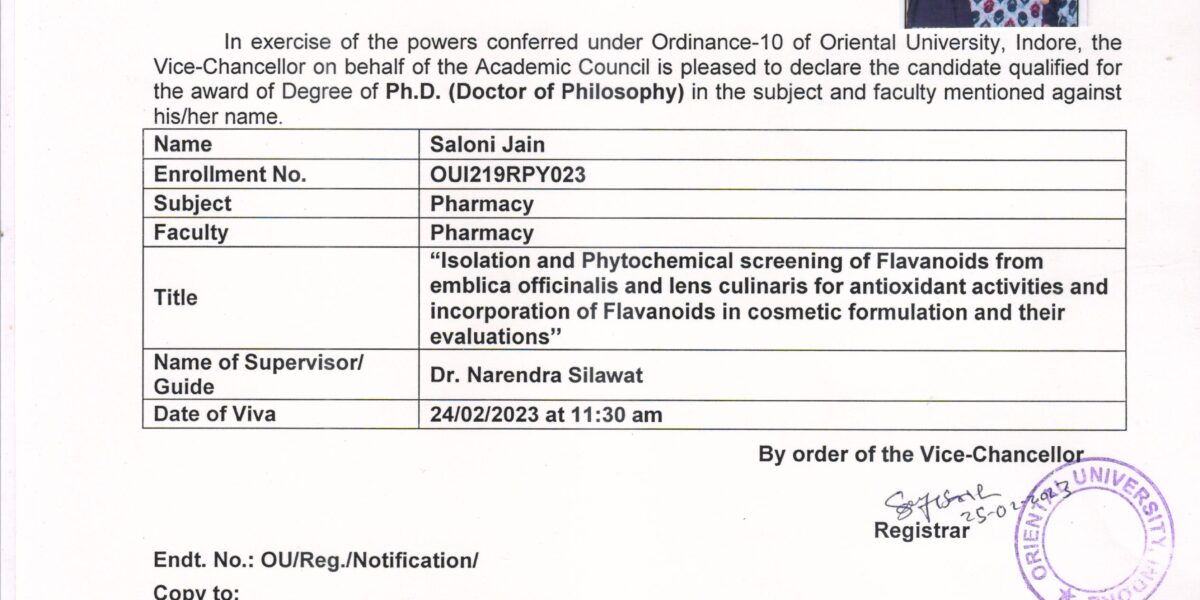 Ph.D. Doctoral Degree awarded to Ms. Saloni Jain